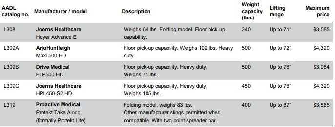 For Alberta residents you may qualify for coverage. Models available though AADL and their prices are in the image below. Medicare always has a Hoyer Advance E in stock.